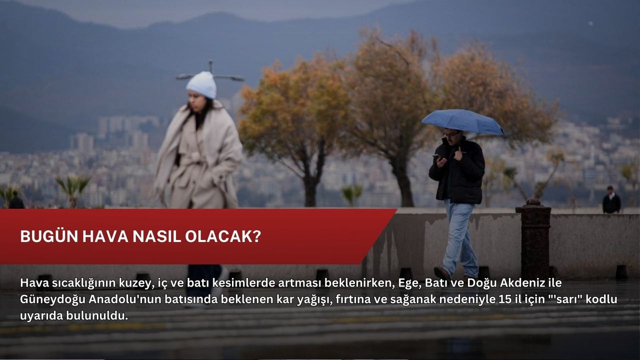 Kıyı kesimlerde sağanak ve gök gürültülü sağanak, iç ve batı kesimlerde yağmur ve karla karışık yağmur, yükseklerinde ve yağış beklenen doğu kesimlerde kar şeklinde görülecek yağışların, Marmara ve Ege'nin batısı, Batı Akdeniz, Doğu Akdeniz'in doğusu ile Güneydoğu Anadolu'nun batısında kuvvetli, Ege ve Batı Akdeniz kıyılarında ise yer yer çok kuvvetli ve şiddetli olması bekleniyor.