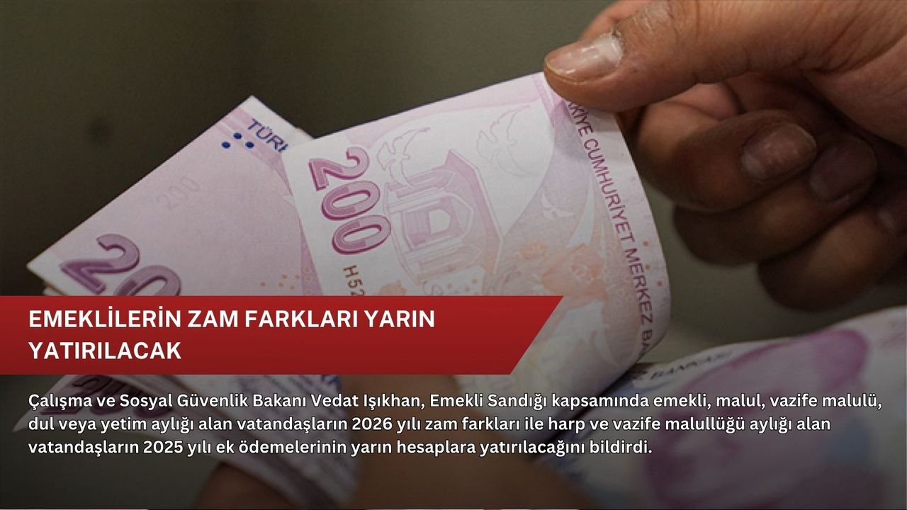 Bakan Işıkhan, NSosyal hesabından yaptığı açıklamada, "Emekli Sandığı kapsamında emekli, malul, vazife malulü, dul veya yetim aylığı alan vatandaşlarımızın 2026 yılı zam farkları ile harp ve vazife malullüğü aylığı alan vatandaşlarımızın 2025 yılı ek ödemelerini yarın (23 Ocak Cuma günü) hesaplarına yatırıyoruz. Ülkemizin emektarları kıymetli emeklilerimiz başta olmak üzere vatandaşlarımıza hayırlı olmasını diliyorum." ifadelerini kullandı.