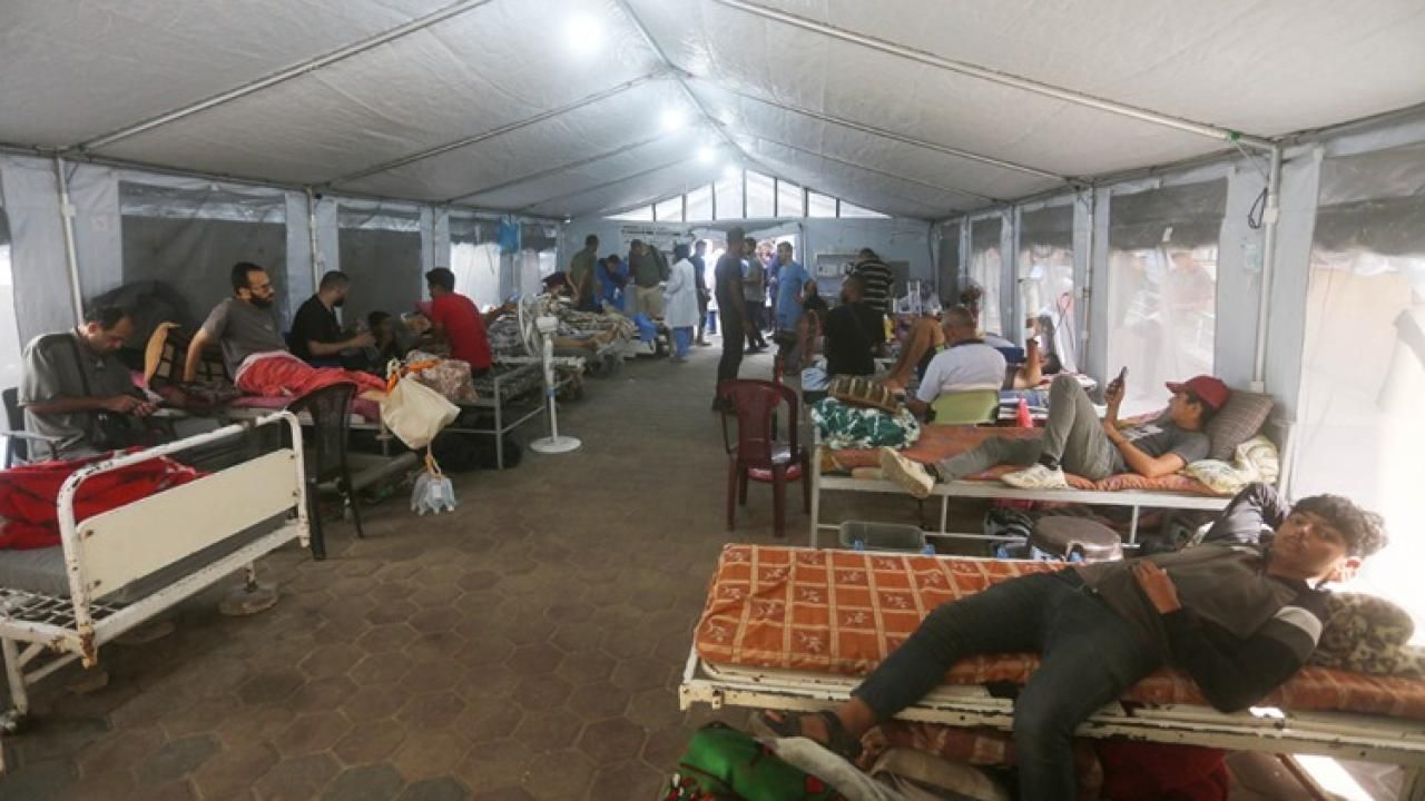 Bina içinde ise koridorlar, merdiven başları dahil olmak üzere yatak koyulabilecek her yerde yatak olduğu ve bunlarda da bir değil birkaç Filistinlinin yattığı görülüyor. Bina içinde kendilerine yer bulamayan hastalar ise bir nevi dışarı taşmış durumda. Onlar için de hastane avlusunda kurulan çadırda hizmet veriliyor. Hastaların çoğunun yerde sünger yataklarda yatması dikkati çekiyor. Bu durum, hastaların hayatını tehdit ediyor.