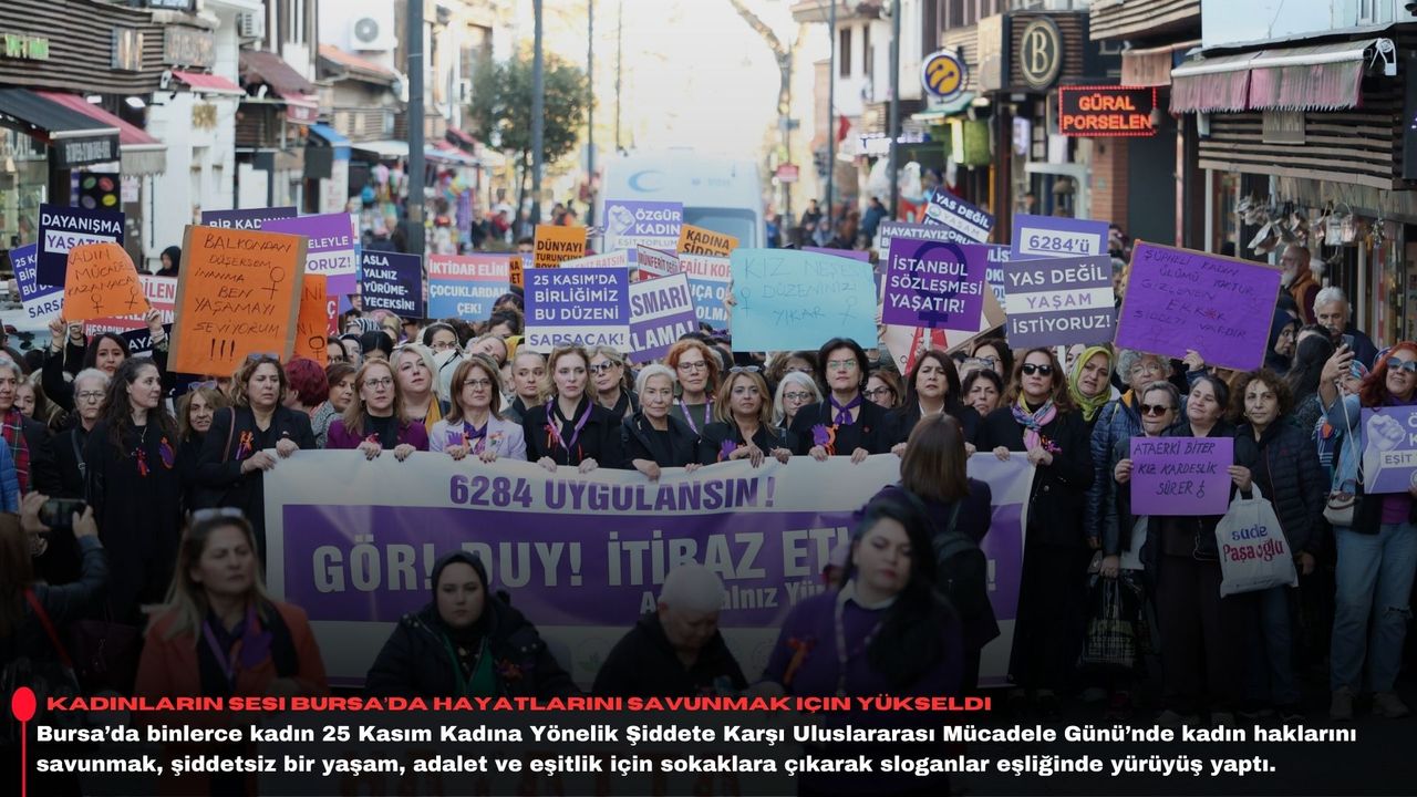 Türkiye’nin pek çok ilde olduğu gibi Bursa’da da binlerce kadın sokaklara çıktı. Cumhuriyet Caddesi’nde toplanan çok sayıda kadın ellerinde pankart ve dövizlerle şiddete, güvencesizliğe, yoksulluğa karşı hep bir ağızdan seslerini yükseltti. Güvenli ve insanca bir yaşam istediklerini belirten kadınlar yürüyüşlerini Hanlar Bölgesi’ndeki Ulu Çarşı girişinde sonlandırarak istek ve taleplerini burada yaptıkları basın açıklamasıyla dile getirdi. Osmangazi, Bursa Büyükşehir ve Nilüfer Kent Konseyi Kadın Meclisleri ile Osmangazi Belediyesi, Bursa Büyükşehir Belediyesi ve Nilüfer Belediyesi’nin ortaklaşa düzenlediği yürüyüşte binlerce kadın bir kişi daha eksilmeyecek, erkek şiddetine boyun eğmeyeceğiz diye haykırdı.
