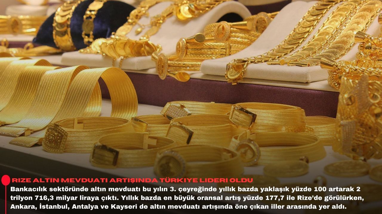 Rize'yi altın mevduatı artışında oransal olarak yüzde 108,1'lik artışla Ankara, yüzde 106,2'lik artışla İstanbul, yüzde 104'lük artışla Antalya, yüzde 103,4'lük artışla Kayseri izledi.