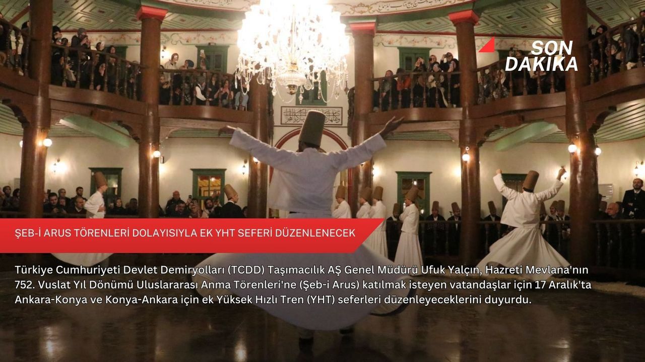 "17 Aralık Çarşamba Ankara-Konya saat 15.05'te Ankara'dan hareket, Konya-Ankara saat 23.05'te Konya'dan hareket. Halkımızın kültürel ve manevi değerlere ulaşımını kolaylaştırmaya yönelik çalışmalarımız doğrultusunda, vatandaşlarımızın bu özel törenlere katılımına destek olduğumuz için mutluluk duyuyor, Hazreti Mevlana Celaleddin-i Rumi'yi vuslata erişinin 752. yılında rahmetle anıyoruz."