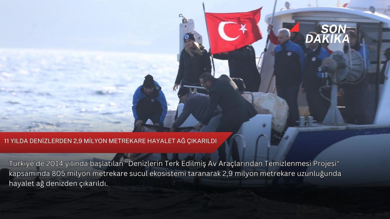 "805 milyon metrekare sucul ekosistem taranmış durumda, 112 bin futbol sahası büyüklüğünde bir alandan bahsediyoruz. 2,9 milyon metrekare hayalet ağ adını verdiğimiz av araçlarını denizden çıkarmış durumdayız. Bu çalışmaları yapmak suretiyle de 9,5 milyon adet deniz canlısının hayatta kalmasını sağladık.