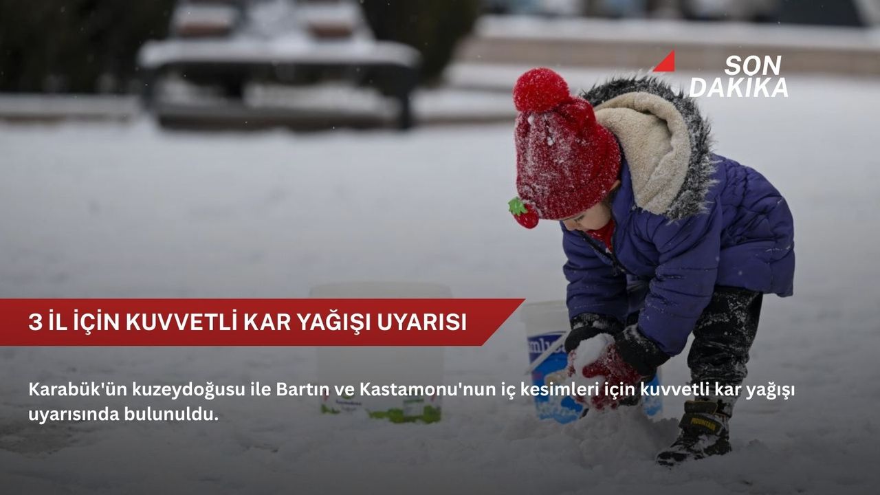Meteoroloji Genel Müdürlüğünden yapılan açıklamaya göre, yarın öğle saatlerinden itibaren Karabük'ün kuzeydoğusu ile Bartın ve Kastamonu'nun iç kesimlerinde kuvvetli kar yağışı bekleniyor.