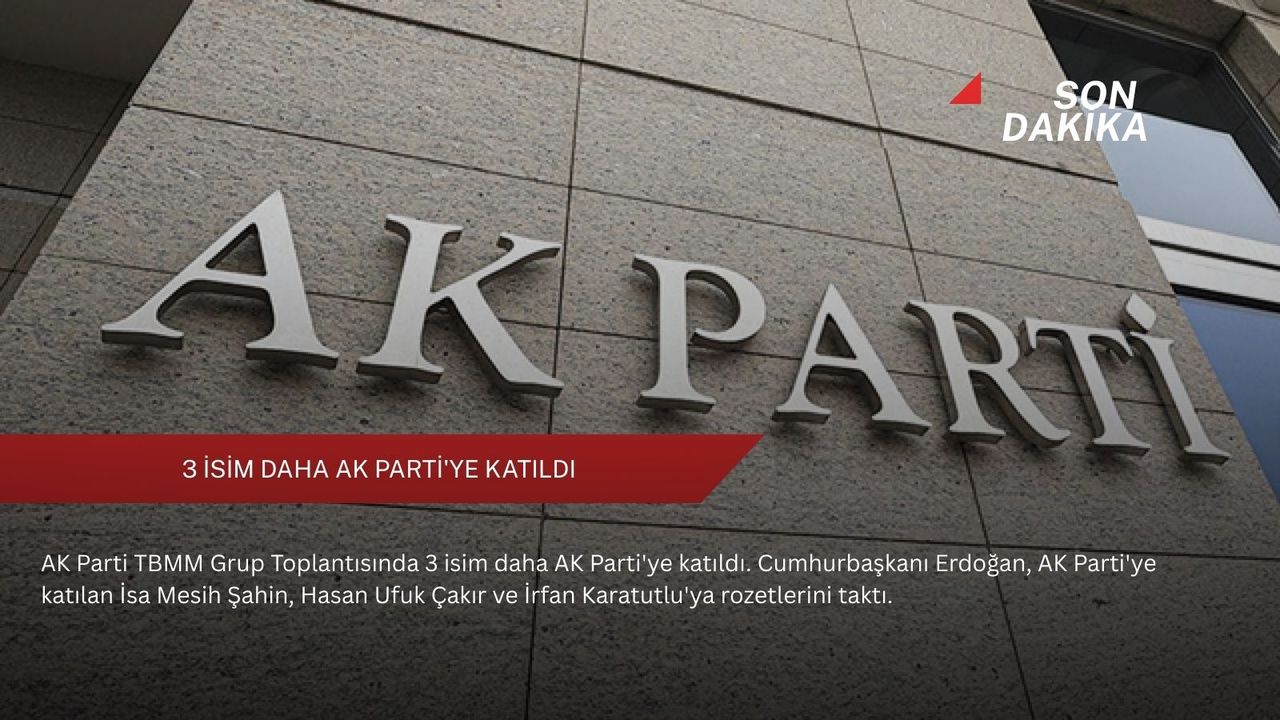 Grup Toplantısında 3 isim daha AK Parti'ye katıldı. Cumhurbaşkanı Erdoğan, İsa Mesih Şahin, Hasan Ufuk Çakır ve İrfan Karatutlu'ya rozetlerini taktı.