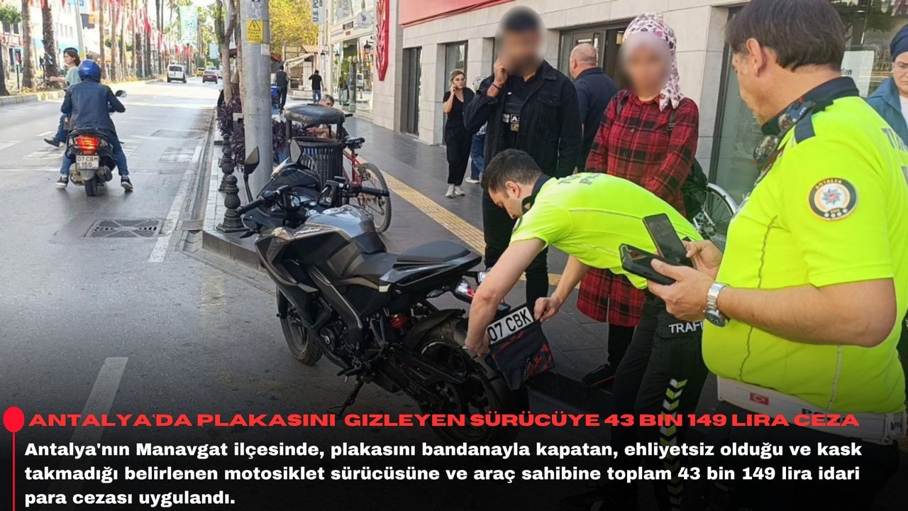 Alınan bilgiye göre, Manavgat İlçe Emniyet Müdürlüğü Trafik Denetleme Büro Amirliği ekipleri, Antalya Caddesi'nde yaptıkları denetim sırasında, plakası okunamayacak şekilde bandanayla kapatılmış bir motosikleti fark etti.