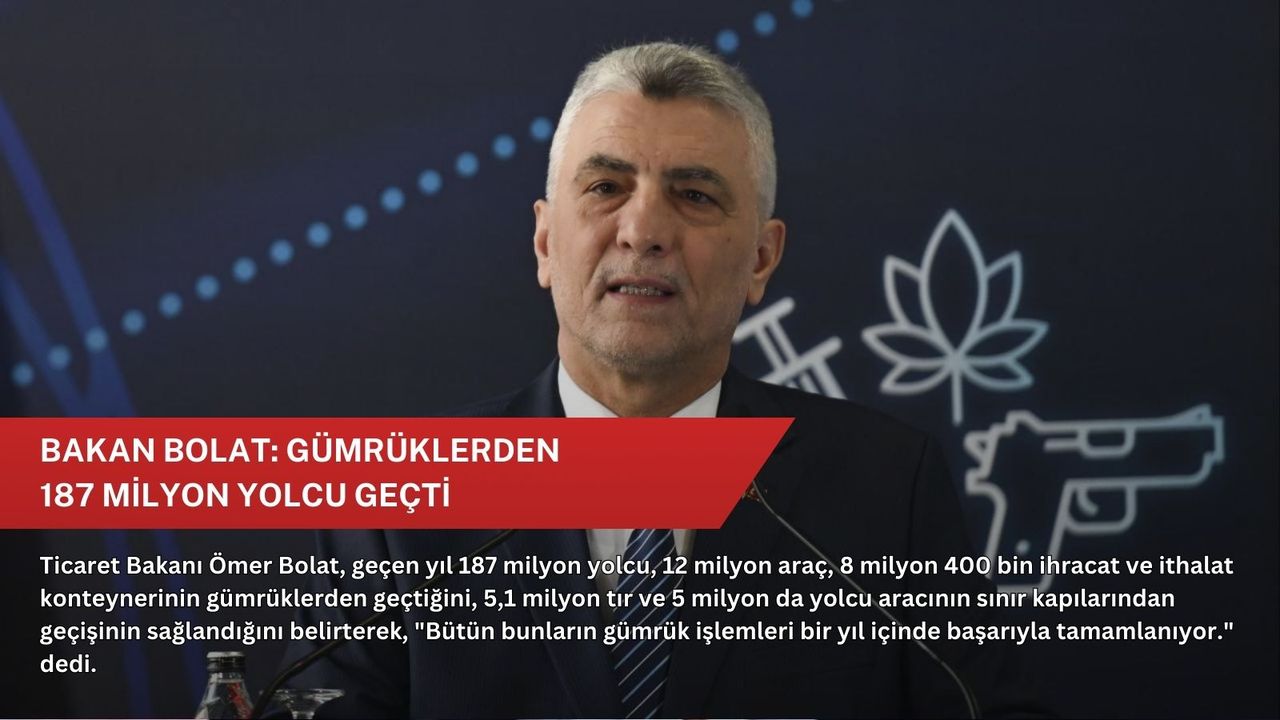"Toplam 161 gümrük idaremiz var, toplam vergi gelirlerinin yüzde 20'sini bu teşkilat topluyor. Gümrükten anında tahsilat yapılıyor, 3-5 saniye sonra Hazine ve Maliye Bakanlığına elektronik ortamda aktarılıyor. 2025'te 187 milyon yolcu, 12 milyon araç, 8 milyon 400 bin ihracat ve ithalat konteyneri gümrüklerimizden geçiyor. 1 milyona yakın uçak, 107 binden fazla gemi seferi var, 5,1 milyon tır, 5 milyon da yolcu aracı sınır kapılarımızdan geçiyor ve bütün bunların gümrük işlemleri bir yıl içinde başarıyla tamamlanıyor."
