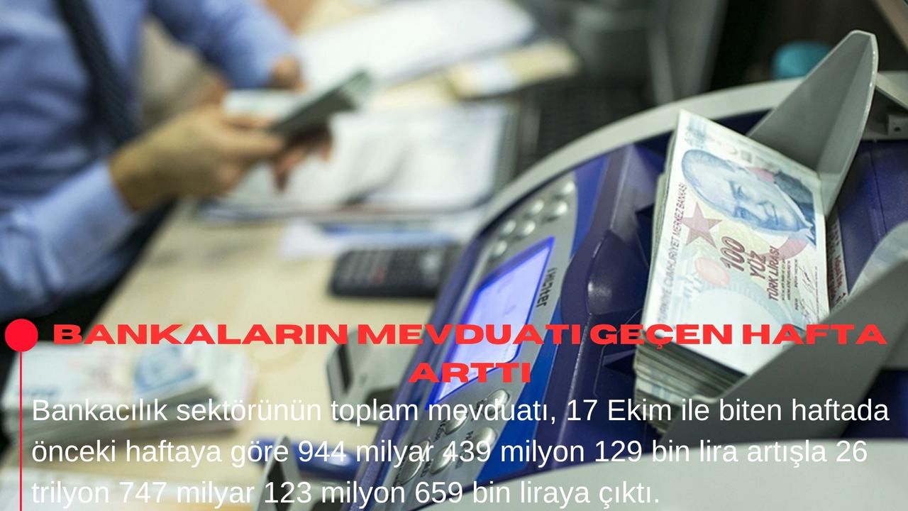 Türkiye Cumhuriyet Merkez Bankası (TCMB), haftalık para ve banka istatistiklerini açıkladı. Buna göre, bankacılık sektörünün toplam mevduatı 17 Ekim ile biten haftada 944 milyar 439 milyon 129 bin lira artarak 25 trilyon 802 milyar 684 milyon 530 bin liradan 26 trilyon 747 milyar 123 milyon 659 bin liraya yükseldi.