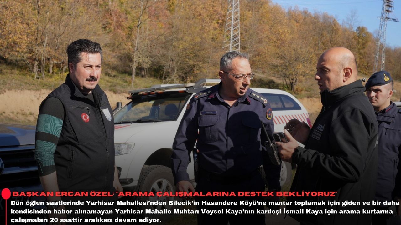 Konu hakkında açıklama yapan Yenişehir Belediye Başkanı Ercan Özel, “Dün öğlen saatlerinde Yarhisar Mahallesi’nden Bilecik’in Hasandere Köyü’ne mantar toplamak için giden, Yarhisar Mahalle Muhtarımızın kardeşi İsmail Kaya’nın kaybolduğunu öğrenir öğrenmez, bölgeye intikal ederek, arama kurtarma çalışmalarına tüm ekibimizle birlikte katıldık. Yaklaşık 20 saatlik bir arama kurtarma çalışmasına rağmen ekiplerimiz maalesef, İsmail Kaya’ya henüz ulaşamadı” dedi.