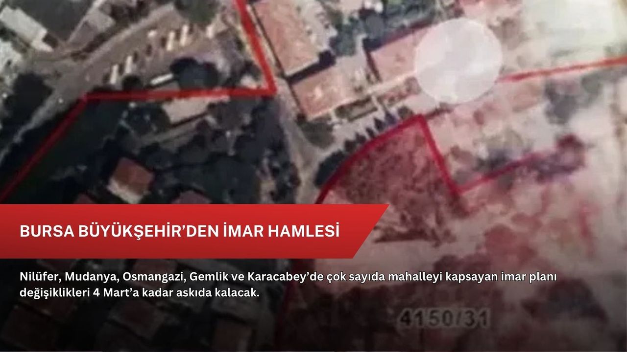Bursa Büyükşehir Belediyesi, Ocak ayı Belediye Meclisi toplantısında onaylanan imar planı değişikliklerini kamuoyuyla paylaştı. Alınan kararlar doğrultusunda, 5 ilçede birçok mahalleyi ilgilendiren nazım ve uygulama imar planı değişiklikleri askıya çıkarıldı.