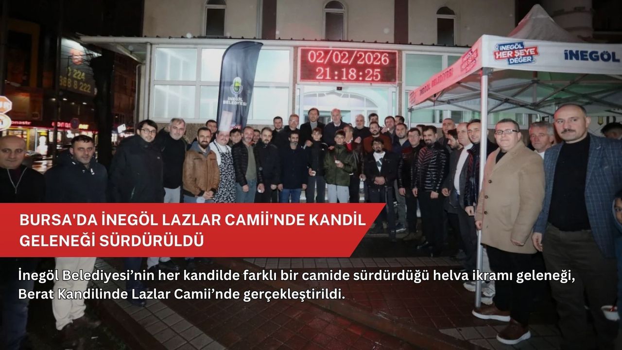 Berat Kandili vesilesiyle Lazlar Camii’nde kılınan yatsı namazına; AK Parti Bursa Milletvekili Ayhan Salman, İnegöl Belediye Başkanı Alper Taban, AK Parti İnegöl İlçe Başkanı Mustafa Durmuş ile parti yöneticileri ve Belediye Meclis Üyeleri de katıldı.