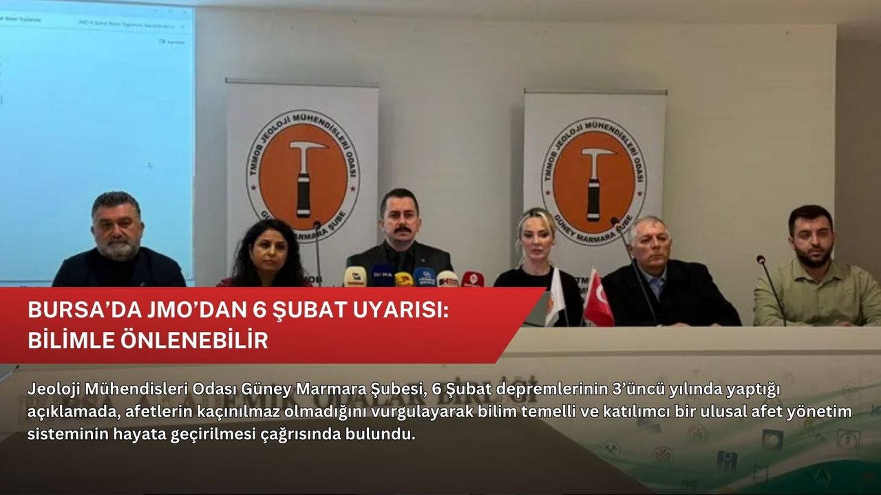 Jeoloji Mühendisleri Odası (JMO) Güney Marmara Şubesi, 6 Şubat 2023’te meydana gelen ve Türkiye’yi derinden sarsan depremlerin üçüncü yıl dönümünde Bursa Akademik Odalar Birliği (BAOB) Yerleşkesi’nde basın açıklaması gerçekleştirdi.