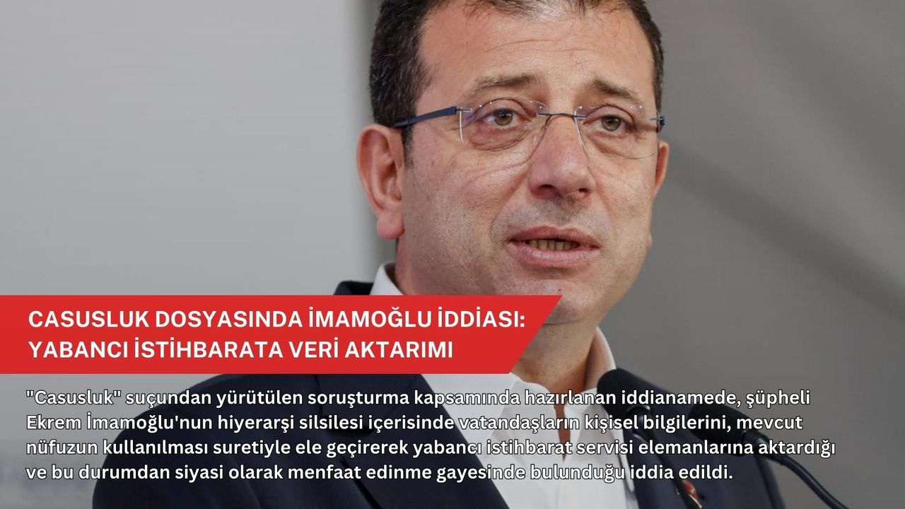İddianamede, "Mevcut deliller ve itirafçı beyanı ele alındığında Ekrem İmamoğlu'nun hiyerarşi silsilesi içerisinde vatandaşların kişisel bilgilerini, mevcut nüfuzun kullanılması suretiyle ele geçirerek yabancı istihbarat servisi elemanlarına aktardığı, takibi süreçte siyasi maksatlı menfaat edinme gayesinde bulunduğu ve bu iştirakin şüpheliler Necati Özkan ve Hüseyin Gün'le birlikte gerçekleştirildiği tespit edilmiştir." şeklindeki değerlendirmeye yer verildi.