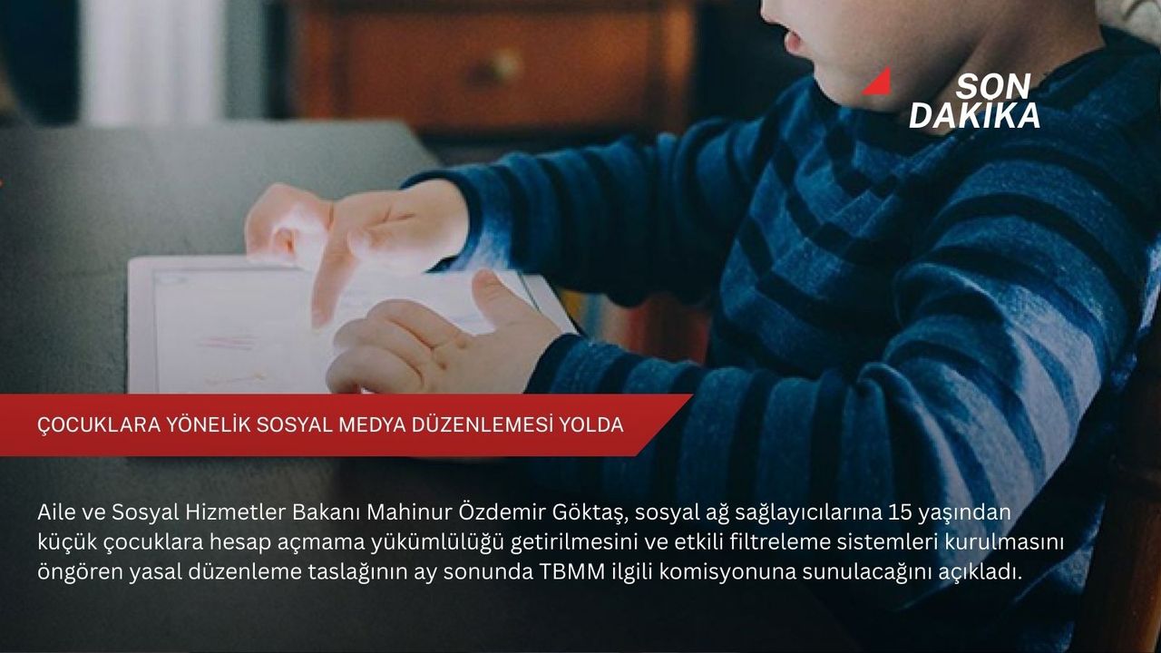 Çocuklara yönelik sosyal medya düzenlemesi çalışmalarına ilişkin soru üzerine Göktaş, bu yasal düzenlemeyle sosyal medya platformlarına özellikle sorumluluk yüklemeyi hedeflediklerini vurgulayarak, sosyal ağ sağlayıcılarına 15 yaşından küçük çocuklara hiçbir şekilde hizmet sunmama ve hesap açmama yükümlülüğü getirilmesini, çocuklar zararlı içeriklere maruz kalmadan etkili filtreleme sistemlerinin kurulmasını önerdiklerini ifade etti.