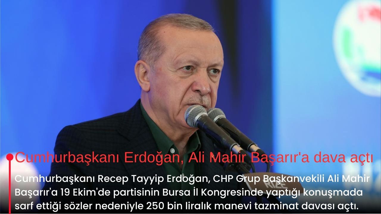 Cumhurbaşkanı Erdoğan'ın avukatı Hüseyin Aydın, yaptığı açıklamada, CHP Grup Başkanvekili Ali Mahir Başarır'ın 19 Ekim'de Bursa İl Kongresi'nde yaptığı konuşmada Cumhurbaşkanı'nı hedef alan mesnetsiz ithamları ve hakaretamiz ifadeleri nedeniyle Ankara Asliye Hukuk Mahkemesi'nde 250 bin liralık manevi tazminat davası açtıklarını bildirdi.