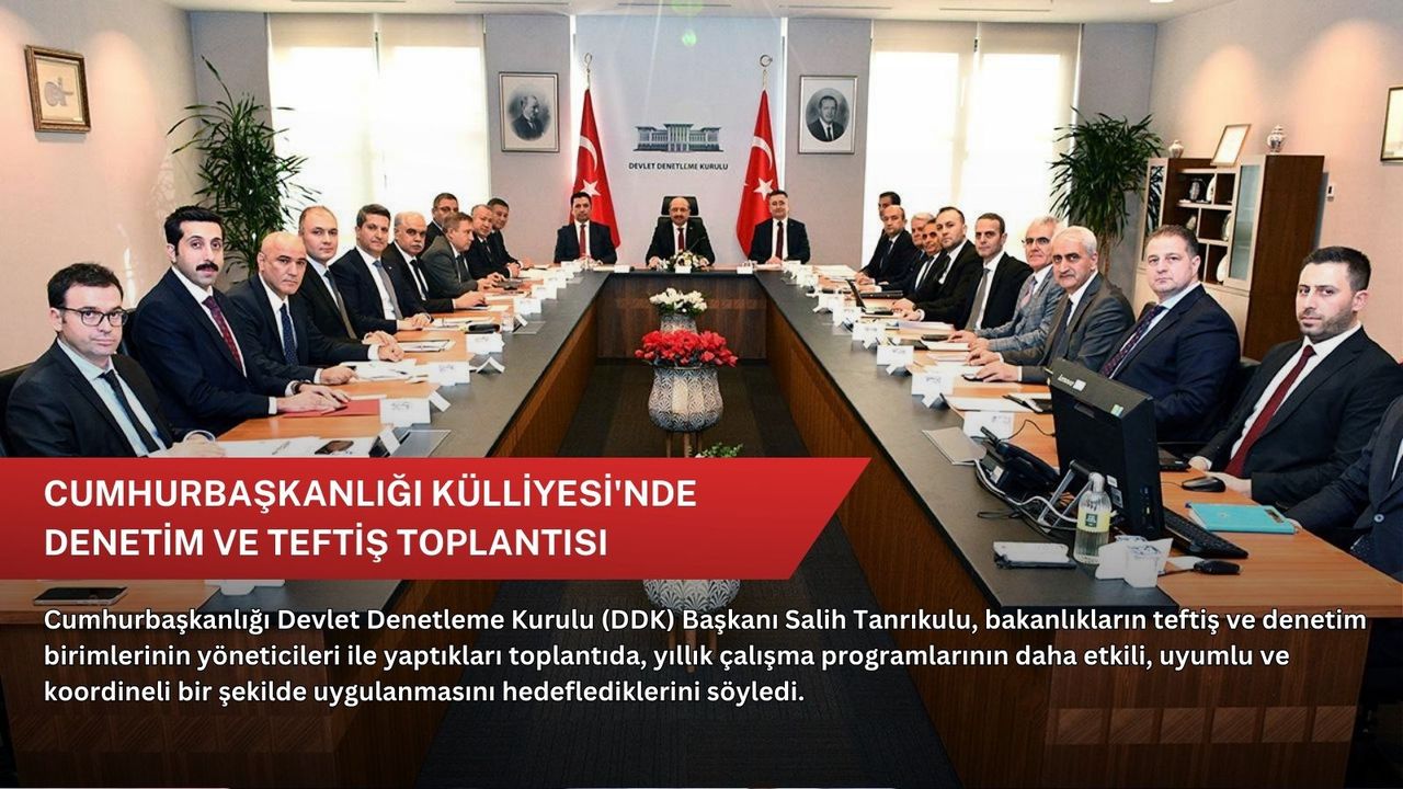 DDK Başkanı Salih Tanrıkulu, NSosyal hesabından yaptığı açıklamada, bakanlıkların teftiş ve denetim birimlerinin yöneticileri ile Cumhurbaşkanlığı Külliyesi'nde verimli bir çalışma toplantısı gerçekleştirdiklerini aktardı.