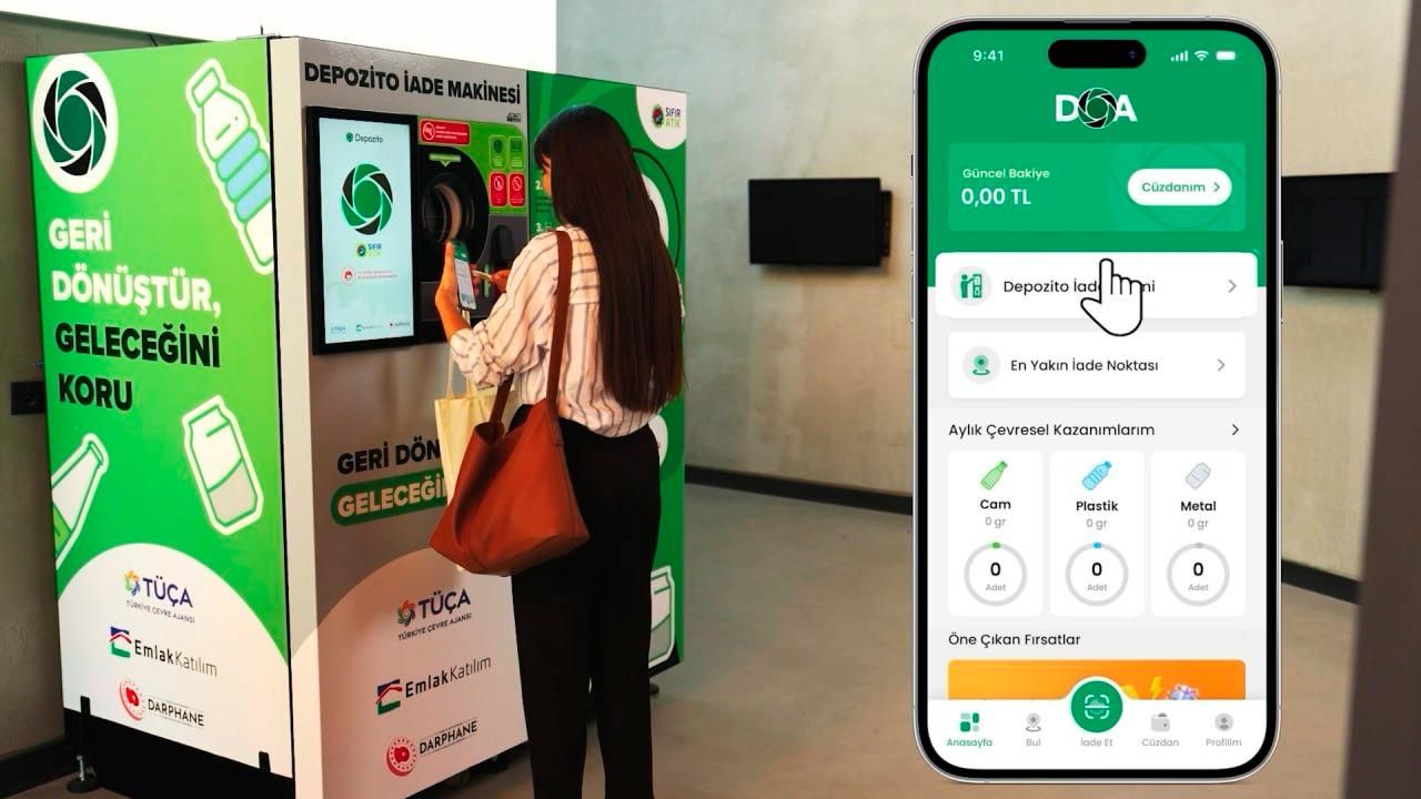 Cumhurbaşkanı Recep Tayyip Erdoğan'ın eşi Emine Erdoğan'ın himayelerinde Çevre, Şehircilik ve İklim Değişikliği Bakanlığınca yürütülen Depozito Yönetim Sistemi projesi kapsamında "Depozitosu Olan Ambalajlar" (DOA) logosu taşıyan plastik, cam ve alüminyum gibi malzemeler, iade makineleri aracılığıyla geri kazandırılıyor.