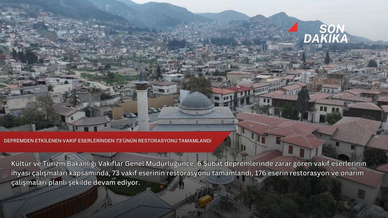 Hatay Vakıflar Bölge Müdürlüğü bünyesinde ise Hatay'da 9 eserin açılışı gerçekleştirildi, 1 eserin restorasyonu tamamlandı ve 82 eserde çalışmalar sürdürülüyor. Antakya'da 11 eserin restorasyonu tamamlanırken, 4 eserin tamamlanmasının ardından ibadete ve ziyarete açılması planlanıyor. Osmaniye'de ise 3 eserin restorasyonu tamamlandı.