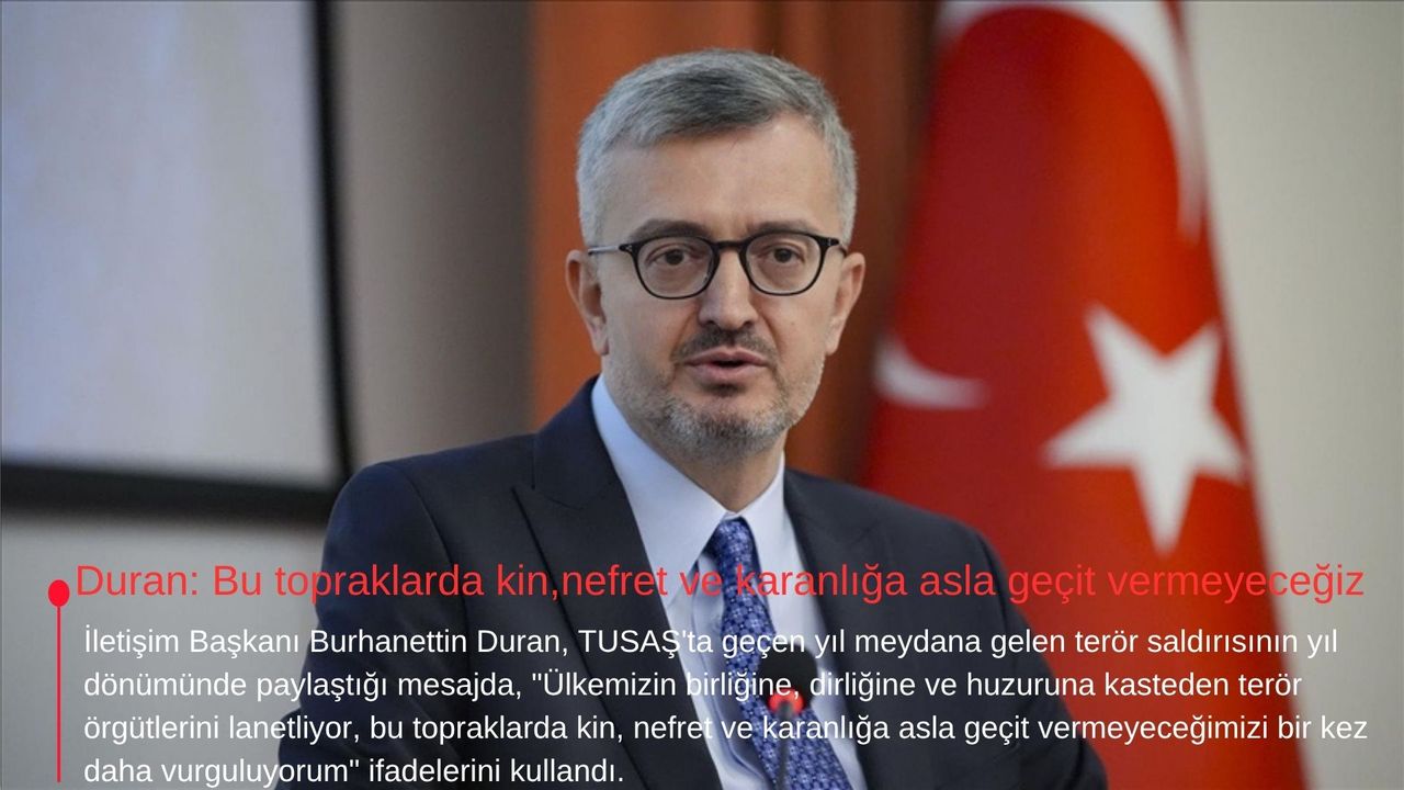 İletişim Başkanı Burhanettin Duran, geçen yıl Türk Havacılık ve Uzay Sanayii (TUSAŞ) Kahramankazan tesislerine yönelik terör saldırısında hayatını kaybeden şehitleri andı.