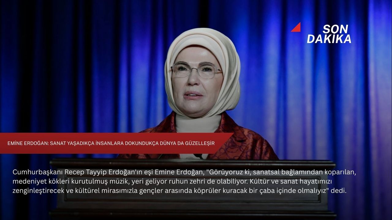 Emine Erdoğan, dünyayı bir günde değiştirmenin imkanının bulunmadığını ama dünyanın insanları değiştirmesini, tanınamaz hale getirmesini önlemenin yollarının olduğunu, bunun en başında kültür ve sanat alanına yapılacak nitelikli yatırımların geldiğini belirterek "Sanat yaşadıkça, insanlara dokundukça ufuklarını genişletip ruhlarını güzelleştirdikçe dünya da güzelleşir. Bugün küresel bir fenomene dönüşen bazı müzik türlerinin, başta çocuklar ve gençler olmak üzere insanları nasıl şiddete yönelttiğini görüyoruz. Ne yazık ki tüm dünyada gençler ağır hakaretler, çirkin düşünceler, cinsel içerikler ve şiddet içeren sözlerin kullanıldığı bir müzik furyasıyla kuşatılmış durumdalar. Kimlik arayışındaki birçok genç, rol modellerini böyle bir dünyada arıyor." değerlendirmesinde bulundu.