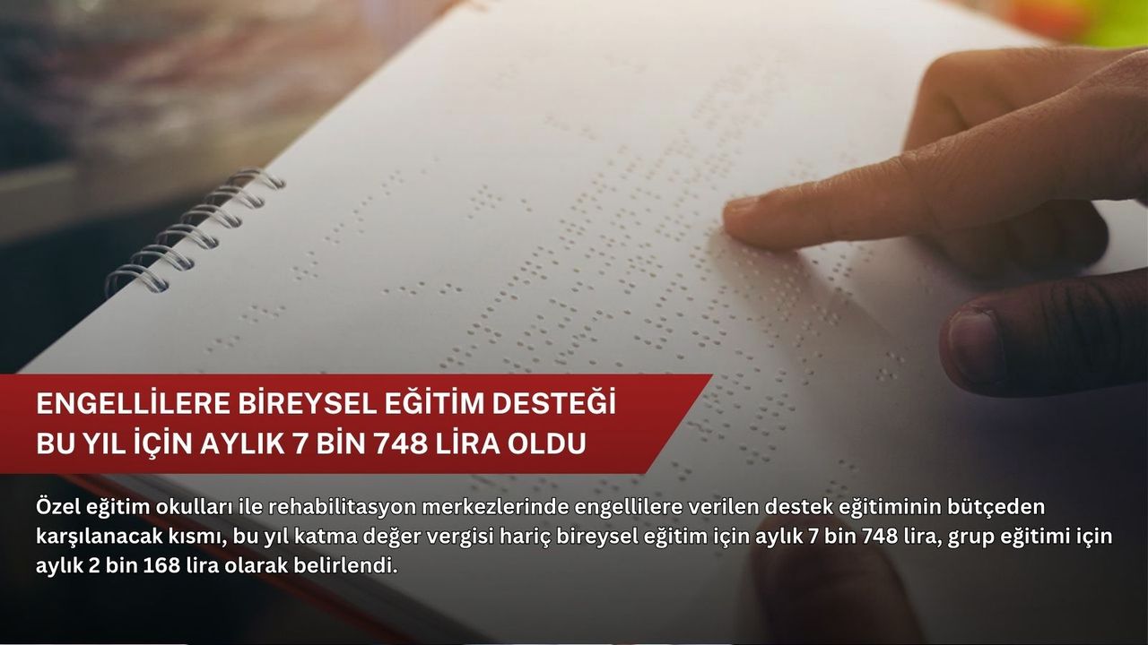 Buna göre 2026'da özel eğitim okulları ile özel eğitim ve rehabilitasyon merkezlerinde engelli bireylere verilen destek eğitiminin bütçeden karşılanacak kısmı, katma değer vergisi (KDV) hariç bireysel eğitim için aylık 7 bin 748 lira, grup eğitimi için aylık 2 bin 168 lira oldu.