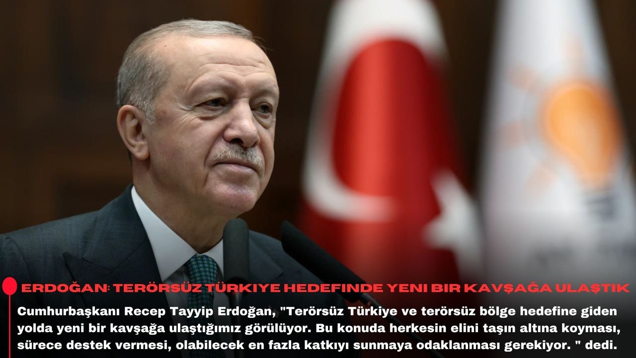 Devletin başı olarak şahsımızın kararlı ve dirayetli tutumu, Cumhur İttifakı ortağımız Milliyetçi Hareket Partisi Genel Başkanı Sayın Devlet Bahçeli'nin cesur ve ufuk açıcı katkıları, partimizin toplumun her kesimini kucaklayan yoğun çalışmaları, devletimizin ilgili bütün kurumlarının olağanüstü gayretleri neticesinde hamdolsun terörsüz Türkiye menziline doğru emin adımlarla yürüyoruz.