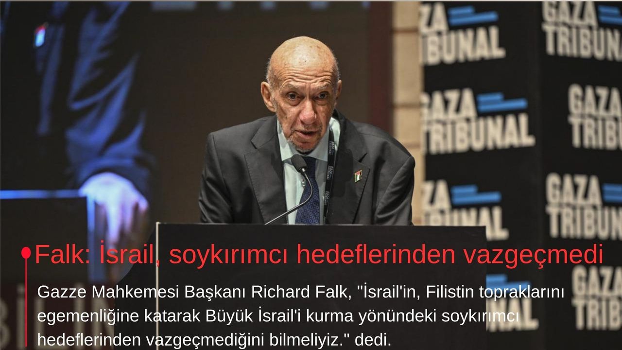 Gazze Mahkemesinin İsrail'in Gazze'deki soykırımın kanıtlanmasından daha fazlasını hedeflediğini aktaran Falk, "Gazze ve Batı Şeria'daki mevcut koşullar, sözlerden veya sembolik politikalardan daha fazlasını gerektiriyor. Eylem ve kararlılık gerektiriyor. İsrail, sözde barışı sağlama amaçlı bu aldatıcı diplomasinin perde arkasında, Filistinlileri yok etme ve büyük İsrail'i kurma oyununu sürdürüyor." ifadelerini kullandı.