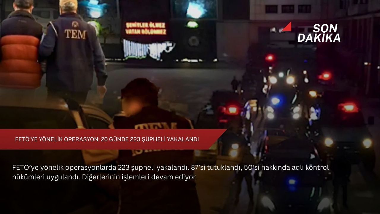 "FETÖ’nün 'gizli yapılanmalar' içerisinde faaliyette bulunan, FETÖ’nün kriptolu haberleşme programı ByLock kullanıcısı olan, ankesörlü telefonlarla örgüt içindeki şahıslarla haberleşmeyi sürdüren, örgüte bağlı esnaflar üzerinden maddi destek sağlayan, 223 şüpheli yakalandı. 87’si tutuklandı, 50’si hakkında adli kontrol hükümleri uygulandı. Diğerlerinin işlemleri devam ediyor."