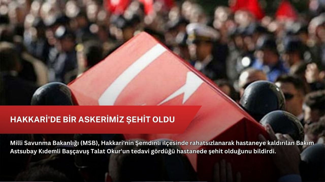 Milli Savunma Bakanlığı (MSB), Hakkari'nin Şemdinli ilçesinde rahatsızlanarak hastaneye kaldırılan Bakım Astsubay Kıdemli Başçavuş Talat Okur'un tedavi gördüğü hastanede şehit olduğunu bildirdi.