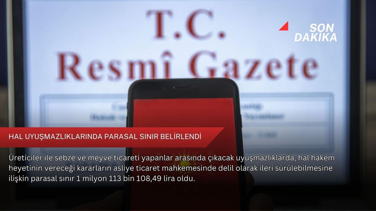 Üreticiler ile sebze ve meyve ticareti yapanlar arasında çıkacak uyuşmazlıklarda, hal hakem heyetinin vereceği kararların asliye ticaret mahkemesinde delil olarak ileri sürülebilmesine ilişkin parasal sınır 1 milyon 113 bin 108,49 lira oldu.