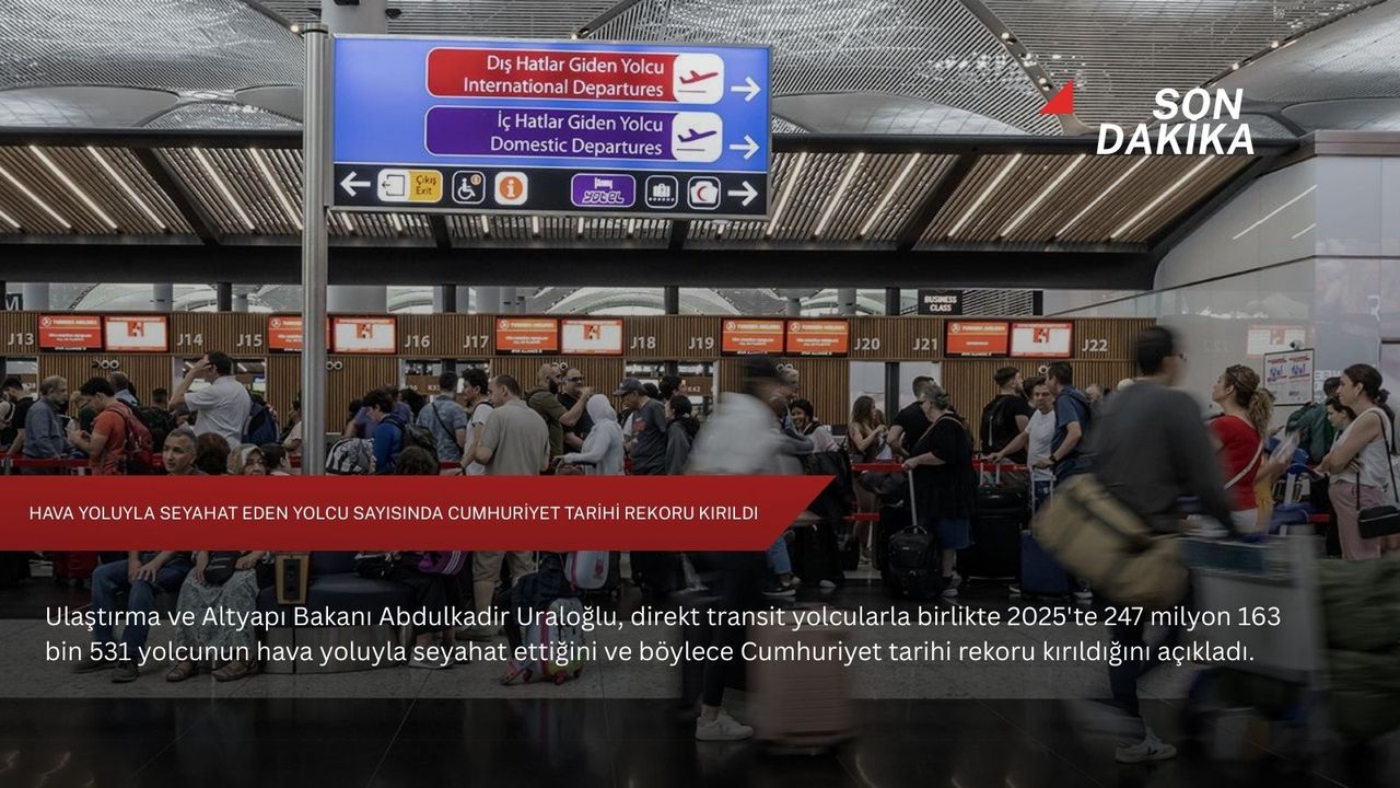 "12 aylık dönemde üst geçişlerle birlikte toplam 2 milyon 507 bin 399 uçak trafiğine ulaştık. Üst geçişler dahil toplam uçak trafiği 2024'e göre yüzde 9,3 artış gösterdi. İç hatlarda 101 milyon 655 bin 2, dış hatlarda ise 145 milyon 362 bin 150 yolcuya hizmet verirken direkt transit yolcularla birlikte toplam 247 milyon 163 bin 531 kişi havalimanlarımızı kullandı. Geçen yıla göre direkt transit dahil toplam yolcu trafiğinde yüzde 7,1 artış oldu. Böylece hava yoluyla seyahat eden yolcu sayısında Cumhuriyet tarihinin rekorunu kırdık."