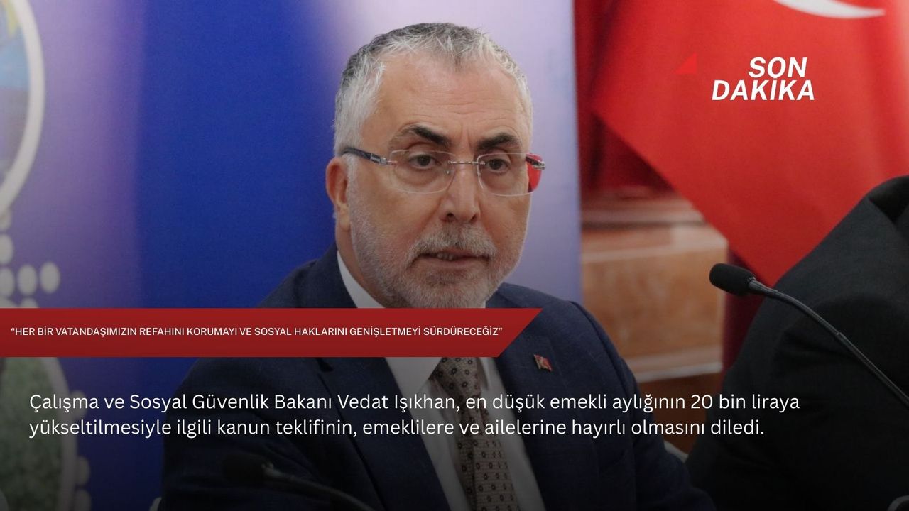 Çalışma ve Sosyal Güvenlik Bakanı Vedat Işıkhan, NSosyal hesabından yaptığı paylaşımda, en düşük emekli aylığının 20 bin liraya yükseltilmesiyle ilgili kanun teklifinin TBMM'ye sunulduğunu hatırlattı.