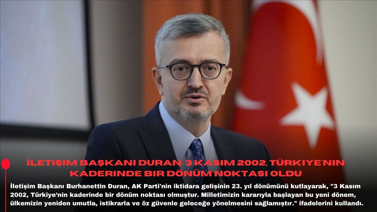 İletişim Başkanı Burhanettin Duran, sosyal medya hesabı üzerinden AK Parti'nin iktidara gelişinin 23. yıl dönümünü kutladı.