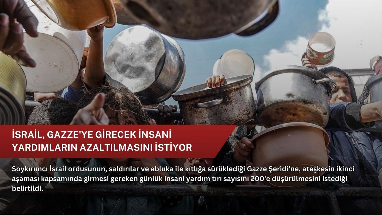 The Jerusalem Post gazetesinin ordu kaynaklarına dayandırdığı haberine göre, İsrail ordusu, ABD'nin desteklediği ateşkes anlaşmasının ikinci aşaması kapsamında Gazze Şeridi'ne girmesi gereken 600 insani yardım tırının 3'te 2 oranında azaltılmasını talep etti.