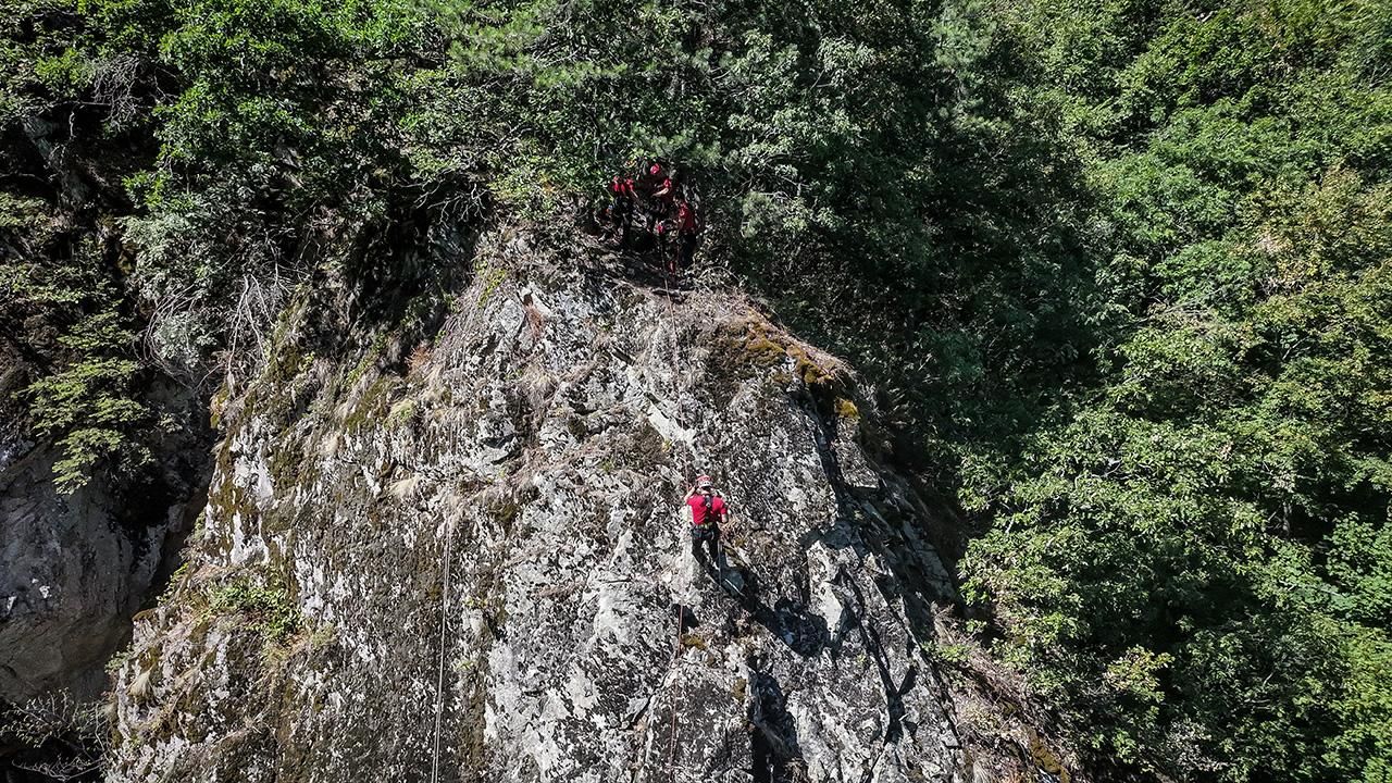 Senaryo gereği mahsur kalanların kurtarılması için sarp kayalık araziye çıkan ekipler, dağ ipleriyle kurulan havai hat ile yaralıyı yaklaşık 50 metre yükseklikten tahliye etti.