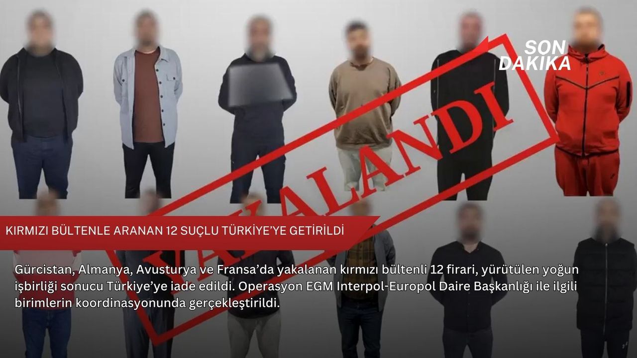 Bakan Yerlikaya, sosyal medya hesabından yaptığı açıklamada, "Kırmızı bültenle uluslararası seviyede aranan F.K., O.U., M.T., K.K., B.T., T.L., İ.K., A.A., S.D., E.Y., Z.S. ve H.D. yakalandı ve ülkemize iadeleri sağlandı" dedi.