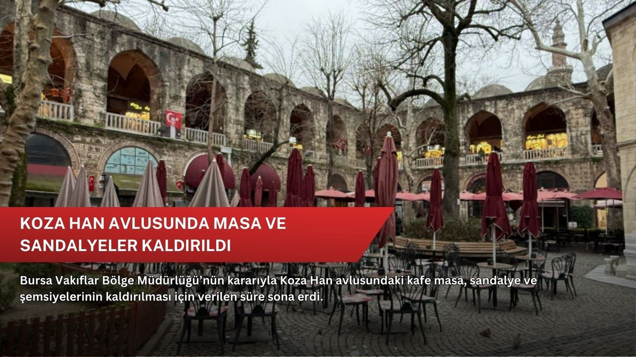 Bursa’nın tarihi simgelerinden Koza Han’da alınan karar doğrultusunda avluda bulunan kafe masa, sandalye ve şemsiyeleri kaldırıldı. Bursa Vakıflar Bölge Müdürlüğü tarafından verilen sürenin bugün itibarıyla dolmasının ardından uygulama hayata geçirildi.
