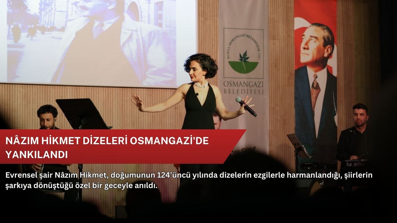 Osmangazi Gösteri Merkezi’nde gerçekleştirilen “İyi ki Doğdun Nâzım Hikmet” adlı anma gecesi, sanat ve edebiyat tutkunlarını bir araya getirdi. Usta şairin zamana meydan okuyan şiirleri, sanatçı Mehtap Meral’in güçlü yorumu ve müzikal anlatımıyla izleyiciyle buluştu. Şiirlerin notalara, notaların duygulara dönüştüğü gecede salonu dolduran sanatseverler, büyük şair için seslendirilen şiir ve şarkılara hep bir ağızdan eşlik ederek konserin coşkusuna ortak oldu. Nâzım Hikmet’in evrensel mirasını yaşatmayı amaçlayan bu özel program, katılımcılara yalnızca bir anma gecesi değil, aynı zamanda unutulmayacak bir sanat yolculuğu sundu.