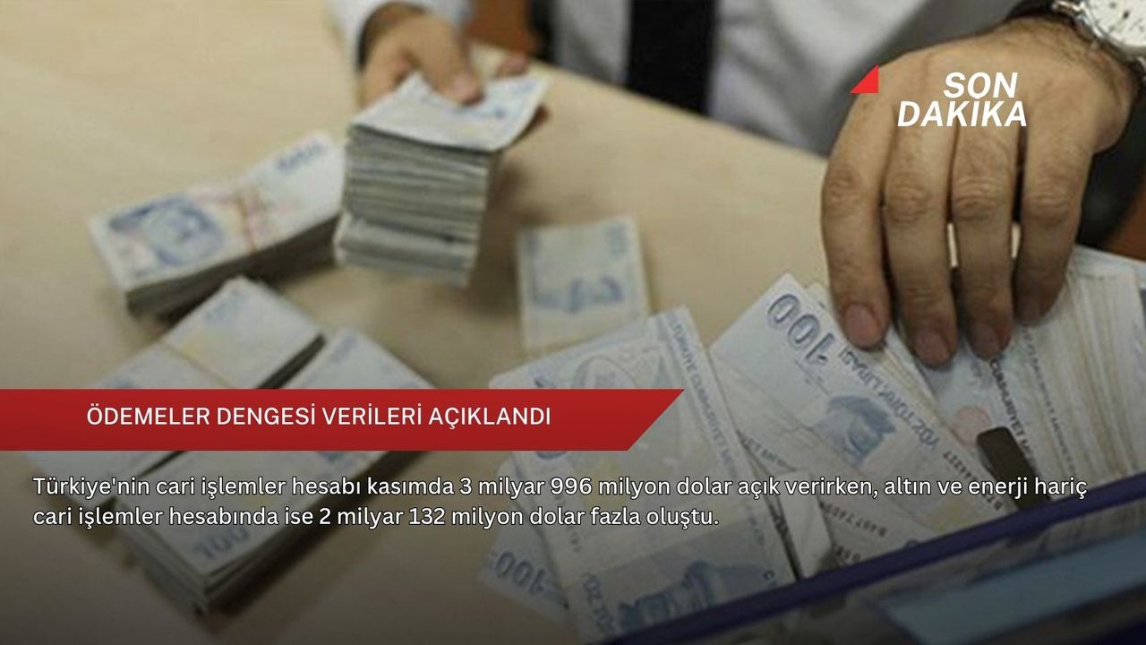Türkiye Cumhuriyet Merkez Bankası (TCMB) tarafından açıklanan ödemeler dengesi verilerine göre, Kasım 2025'te cari işlemler hesabında 3 milyar 996 milyon dolarlık açık, altın ve enerji hariç cari işlemler hesabında ise 2 milyar 132 milyon dolarlık fazla oluştu.