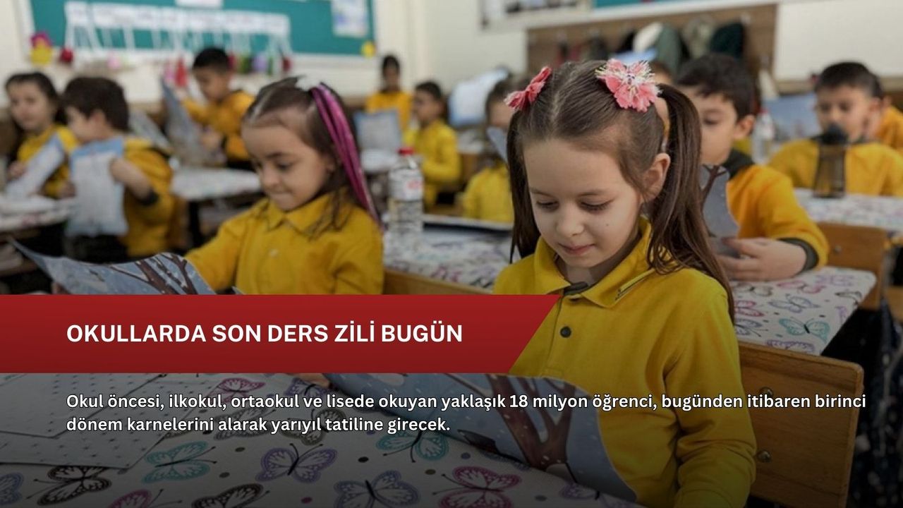 Türkiye'de 8 Eylül 2025'te başlayan 2025-2026 eğitim öğretim yılının birinci dönemi bugün sona erecek. İlk ve ortaöğretim kurumlarındaki yaklaşık 18 milyon öğrenci, yarıyıl tatilini yapmak üzere bugün karnelerini alacak.