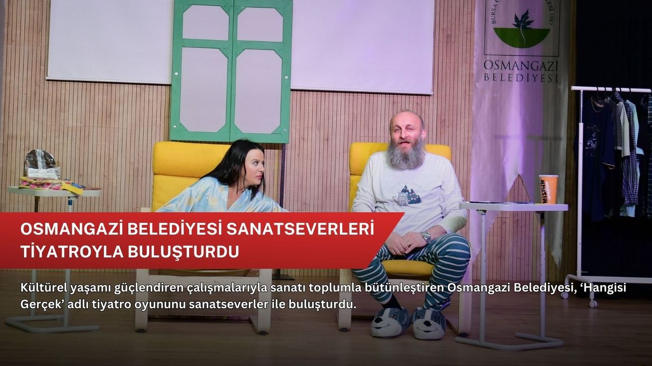 Sanata verdiği destek ile birlikte ilçedeki yaşam kalitesini artırarak, tiyatroyu geniş kitlelerin beğenisine sunan Osmangazi Belediyesi, ünlü oyuncular Çetin Altay ve Özlem Karaaytu’nun sahnelediği ‘Hangisi Gerçek’ adlı tiyatro oyununa perde açtı. Osmangazi Gösteri Merkezi’nde sanatseverlerin yoğun ilgisiyle gerçekleşen etkinlikte modern şehir insanının günlük hayatına mizah aynası tutan komedi türündeki oyun, izleyicilere keyif dolu anlar yaşattı.