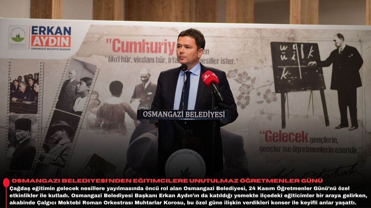 Saygı duruşu ve İstiklal Marşı’nın ardından sözlerine başlamadan önce tüm eğitimcilerin 24 Kasım Öğretmenler Günü’nü içtenlikle kutlayan Osmangazi Belediye Başkanı Erkan Aydın, “Sadece bir gün değil, her gün onların günü olsun. Öğretmenlerimiz, hepimiz için hayatımızda unutamadığımız izler bırakan, anlar bırakan ve kaç yaşına gelirsek gelelim hatıralarımız olan çok güzel insanlar.” dedi.