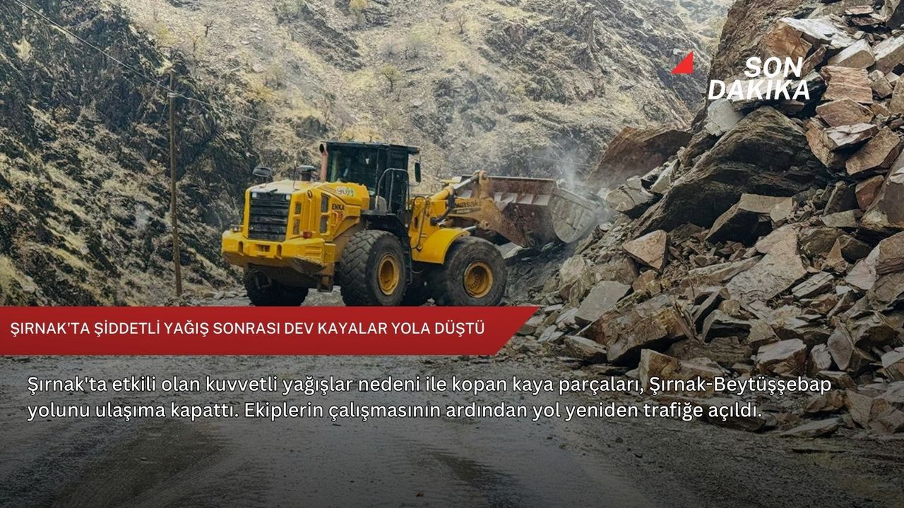Şırnak'ın Beytüşşebap ilçesine bağlı Taşarası köyü yakınlarındaki Komato bölgesinde iki gündür etkili olan şiddetli yağış sonrası dev kaya parçaları yola düştü.