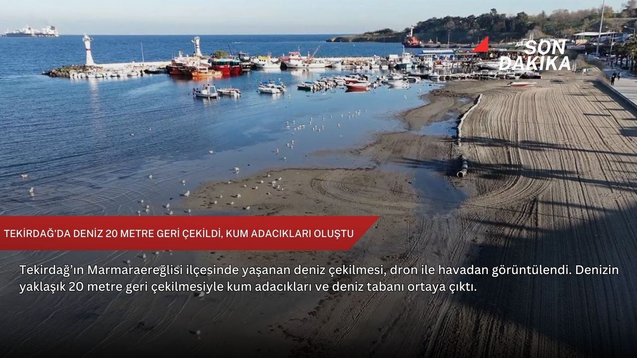 Tekirdağ'ın Marmaraereğlisi ilçesinde yaşanan deniz çekilmesiyle ortaya çıkan kum adacıkları dikkat çekti. Bazı noktalarda deniz tabanının tamamen ortaya çıktığı gözlemlendi.