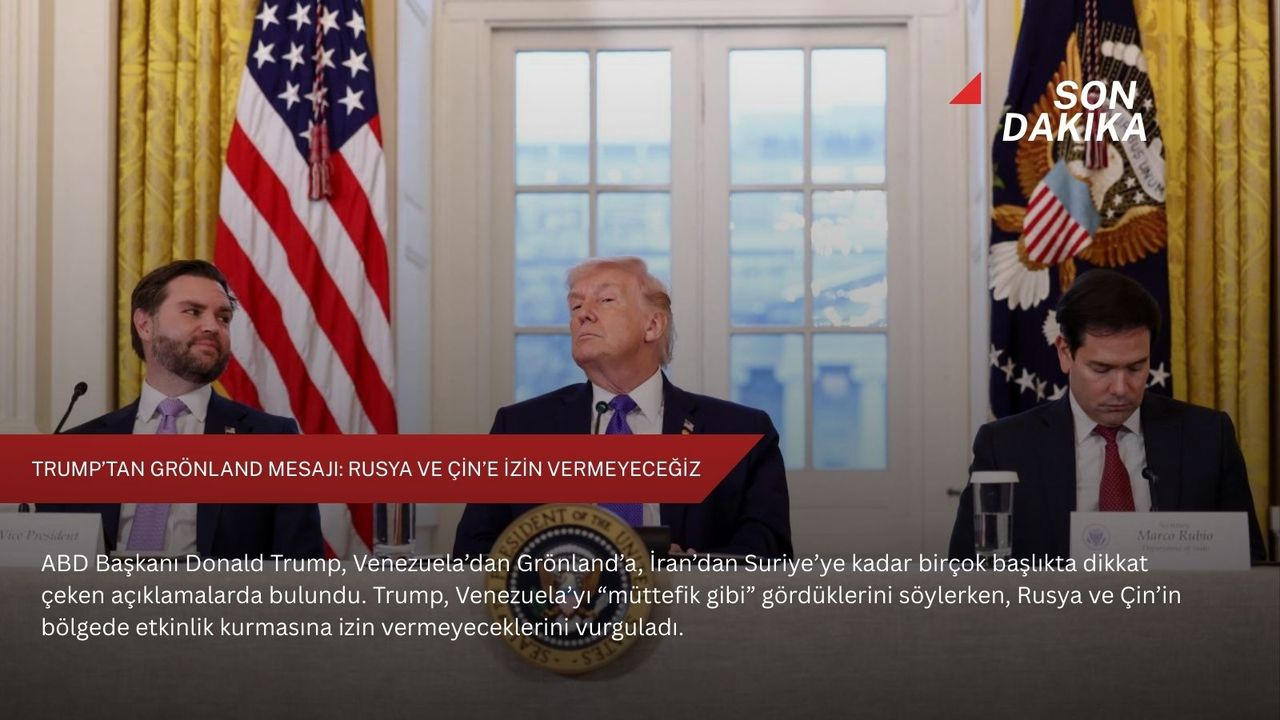 ABD Başkanı Trump, "Çin veya Rusya'nın Grönland'ı işgal etmesine izin veremeyiz. Çin veya Rusya'nın Venezuela'yı işgal etmesine de izin veremeyiz. Eğer bu yaptığımız şeyi yapmasaydık, Çin veya Rusya Venezuela'da olurdu." diye konuştu.