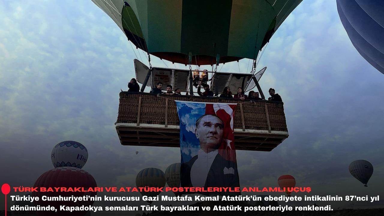 Nevşehir'in Göreme beldesindeki sıcak hava balonları kalkış alanında, turistlere yönelik tur için hazırlanan balon sepetlerine, "10 Kasım Atatürk'ü Anma Günü"nde Türk bayrakları ve Atatürk posterleri asıldı.