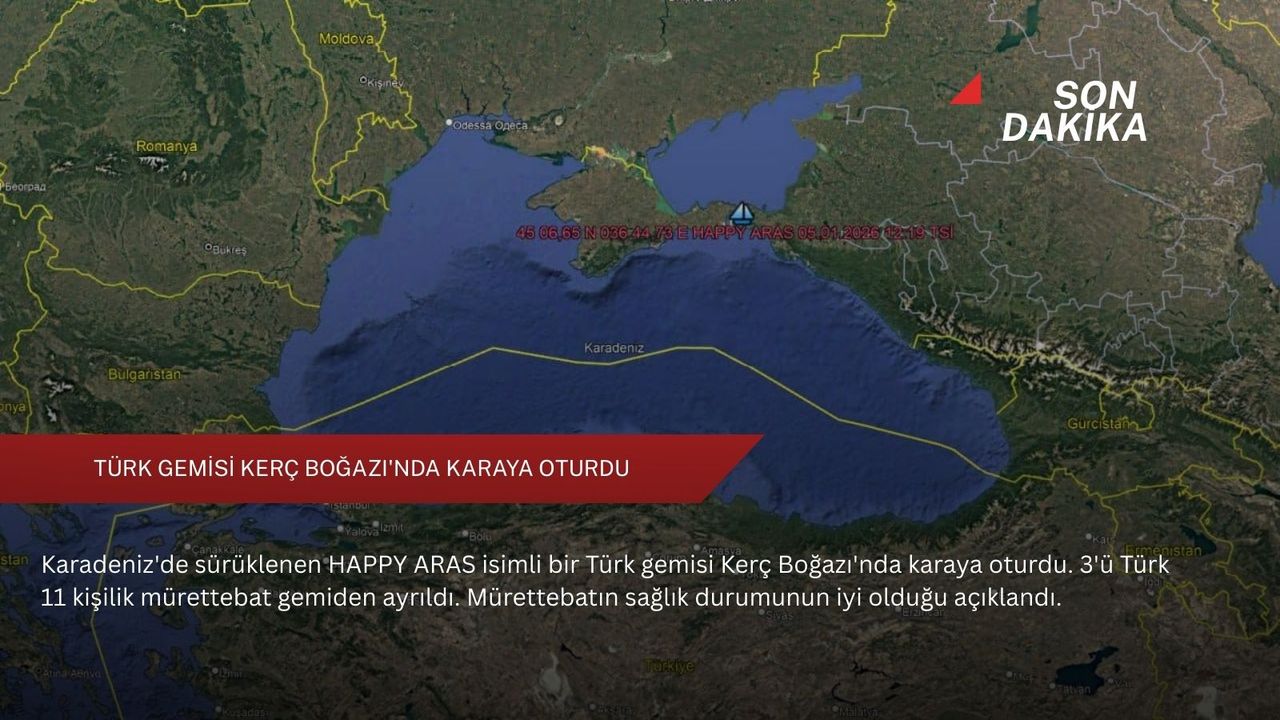 "Karadeniz'de sürüklenerek Kerç Boğazı güneyinde karaya oturarak su alan Türk sahipli 'HAPPY ARAS' gemisindeki 3'ü Türk 11 mürettebatın tamamı Ana Arama Kurtarma Koordinasyon Merkezi koordinesinde emniyetle gemiden ayrılmıştır. Mürettebatın sağlık durumu iyidir. Gelişmeler takip edilmektedir."