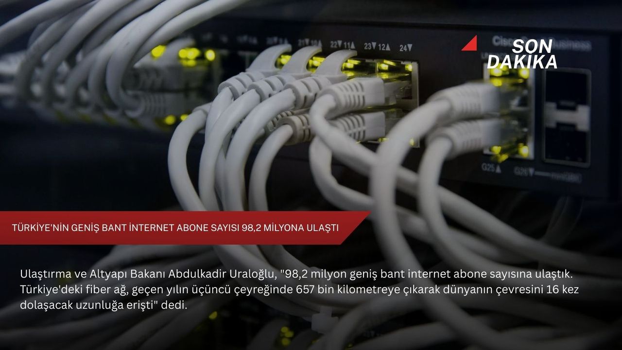 "Ülkede 98,2 milyon geniş bant internet abone sayısına ulaştık, internet abone sayısı bir önceki yılın aynı dönemine kıyasla yüzde 1,9 arttı. En yüksek artış, yüzde 26,3 ile 'eve kadar fiber' abone sayısında, onu takiben de yüzde 26,1 ile 'kablosuz telsiz internet (sabit)' abone sayısında gerçekleşti. Fiber altyapı açısından bir önceki yılın aynı döneminde yaklaşık 588 bin kilometre olan fiber uzunluğu, 2025 yılı üçüncü çeyreğinde yaklaşık 657 bin kilometre olarak hesaplandı ve yüzde 11,7 artış görüldü. Böylece fiber ağımız, dünyanın çevresini 16 kez dolaşacak uzunluğa erişti."