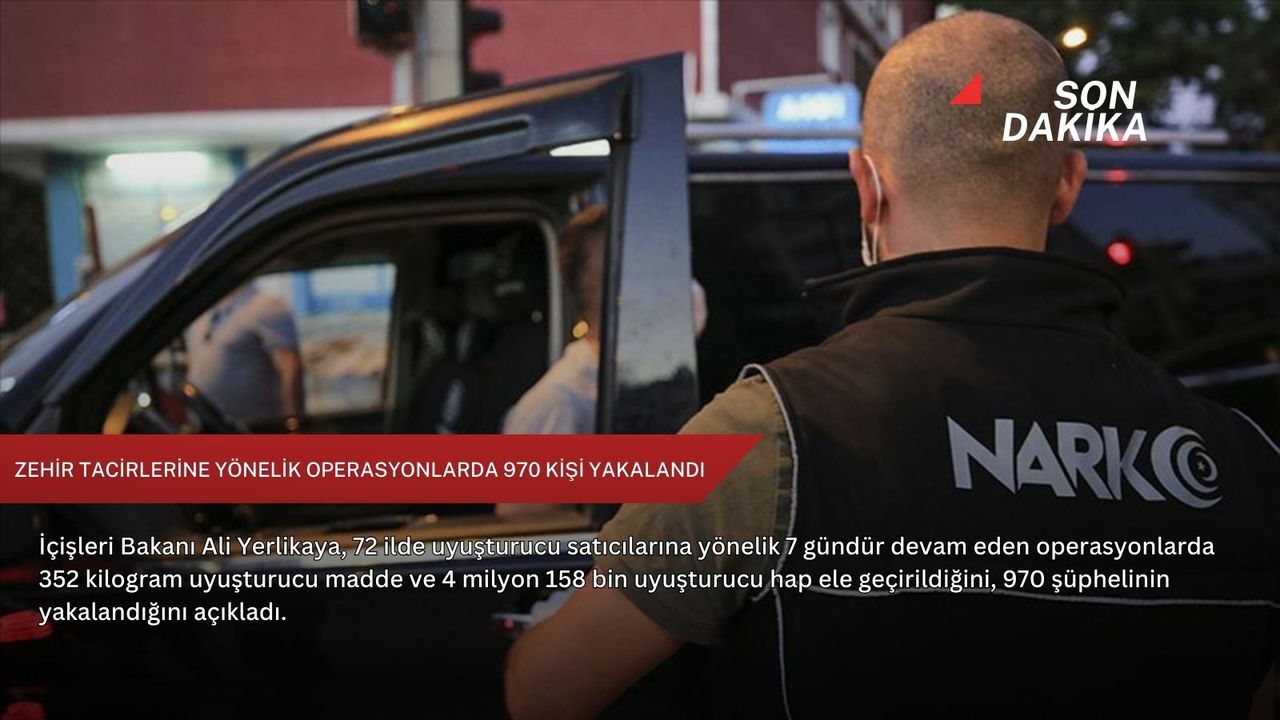 Operasyona ilişkin, "Uyuşturucu madde satıcılarına yönelik son 7 gündür devam eden operasyonlarımızda, 352 kilogram uyuşturucu madde ile 4 milyon 158 bin uyuşturucu hap ele geçirerek, insanlara arz edilmesini ve toplum sağlığına zarar vermesini engelledik. 970 şüpheliyi yakaladık" bilgilerini veren Yerlikaya, operasyonları koordine eden cumhuriyet başsavcılıklarını, Emniyet Genel Müdürlüğü Narkotik Suçlarla Mücadele Başkanlığını ve operasyonları gerçekleştiren il emniyet müdürleri ile polisleri tebrik etti.